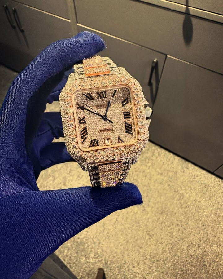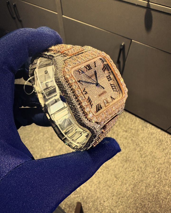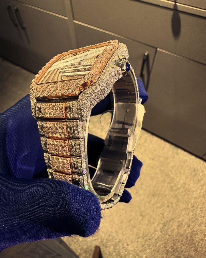Iced Out 41mm Santos Yellow Gold Two tone Moissanite Watch combines luxury design with everyday reliability. Finished in 14K gold plating, it features a rose dial with white hands and durable mineral crystal glass. Powered by precise Japan-made quartz movement, this watch is fully iced out with thousands of Moissanite stones totaling 30 carats, delivering brilliance and bold style. Water-resistant up to 100 meters, it is built for both elegance and performance.